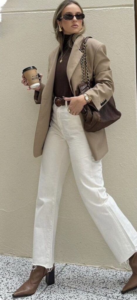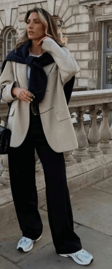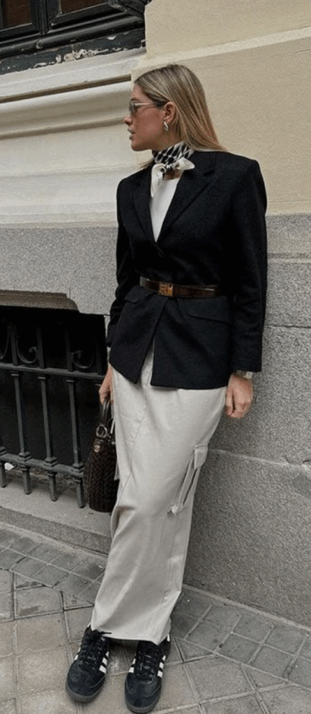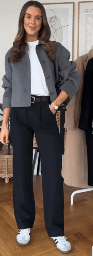 Si buscas un look más casual-chic, combina estos outfits con unas deportivas básicas. Para mantener la formalidad en reuniones importantes, unos botines elegantes o mocasines son la opción ideal.